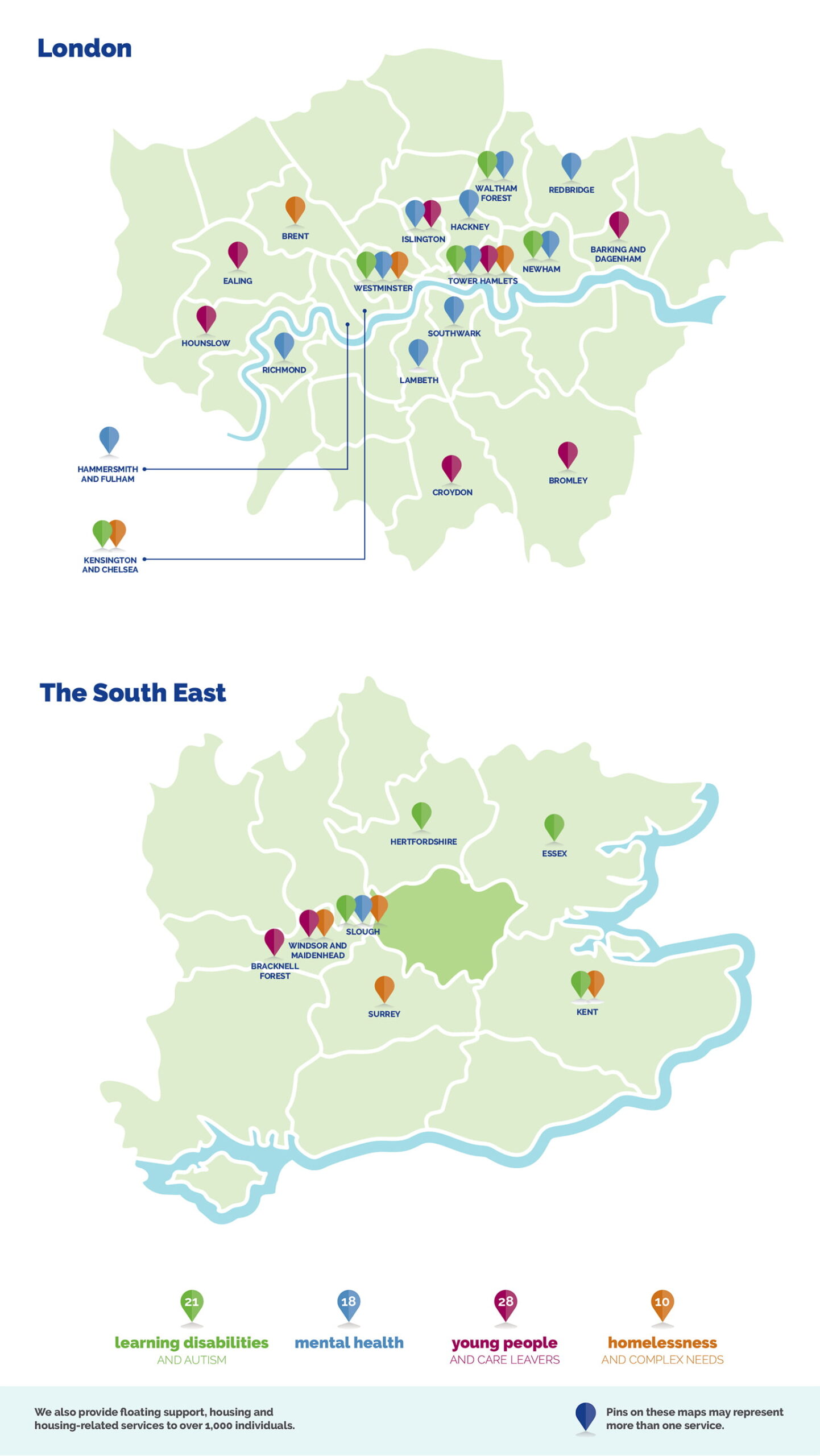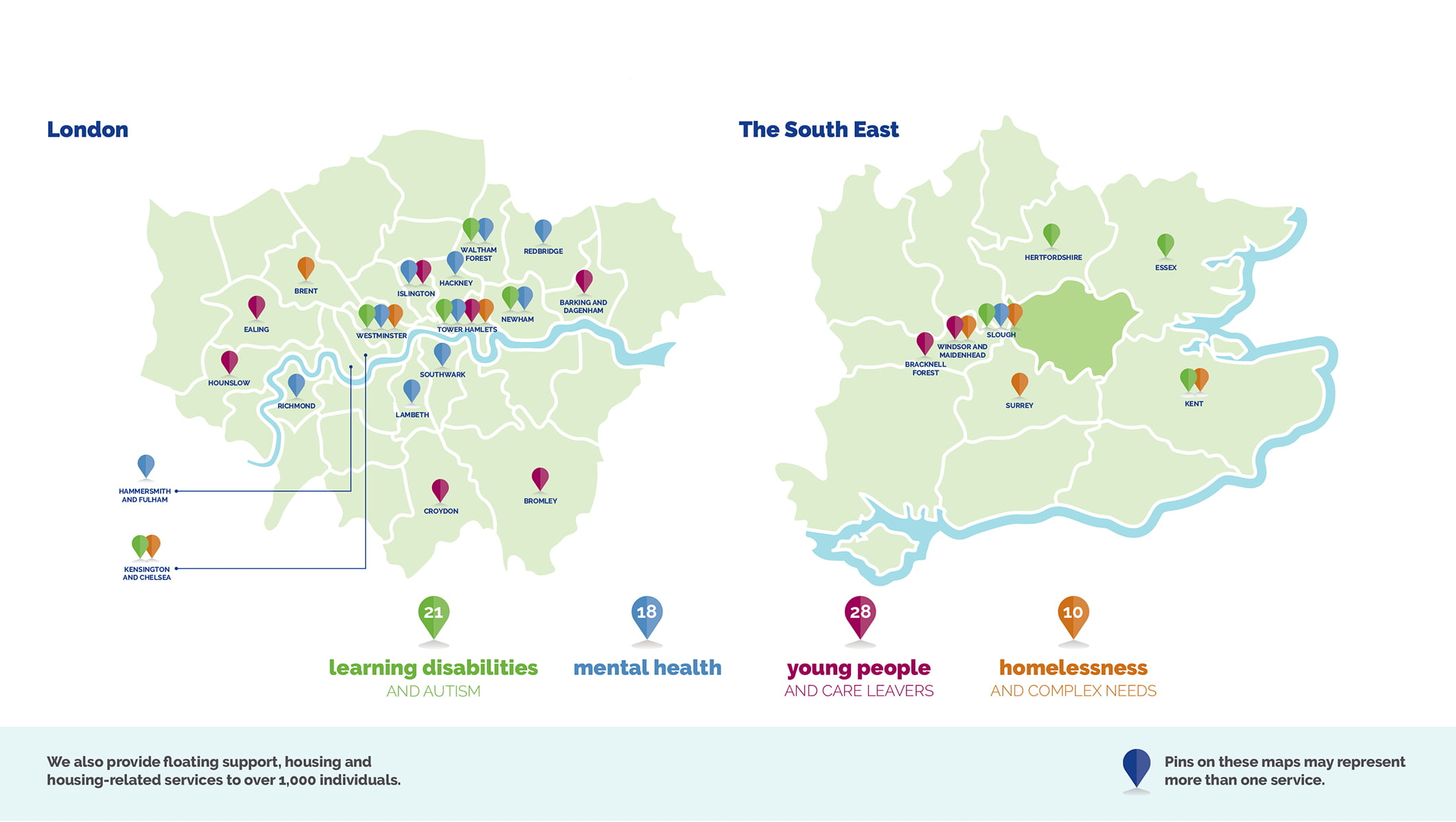 We deliver over 120 care, support and accommodation services across 32 local authorities across London and the South East.